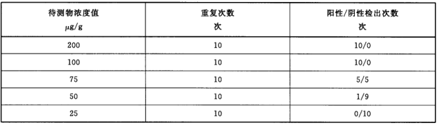 对于定性方法来说,低于临界浓度时选择性是不可靠的。该临界值会随着试验条件中的试剂、加标量、基质等不同而变化。确定定性方法的LOD时,可以通过往空白样品中添加几个不同浓度水平的标液,在每个水平分别随机检测10次,记录检出结果(阳性或阴性),绘制样品检出的阳性率(写)或阴性率(%)对添加浓度的曲线,临界浓度即为检测结果不可靠时的拐点。定性分析中临界值的确定可参考下表进行。如表示例中,当样品中待测物浓度低于100μg/g时,阳性检测结果已经不具备100%的可靠性。