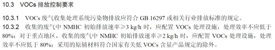 不符合上述条件的,即重点地区,收集废气中的NMHC初始排放速率大于或等于2kg/h,其他地区,收集废气中的NMHC初始排放速率大于或等于3kg/h,需要安装VOCs治理设施,如未使用规定的低VOCs产品,在满足VOCs排放浓度和排放速率均达标的前提下,治理设施的去除效率不得低于80%;如全部使用符合规定的低VOCs产品,治理设施去除效率不作要求,VOCs排放浓度和排放速率达标即可。